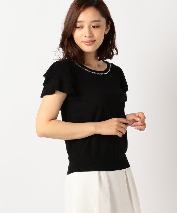 いつもより大人っぽいコーディネートが楽しめる、透かし編みのニットです。ボディラインに適度にフィットするきれいなシルエットが自慢。動きに合わせて揺れるフリルスリーブや襟元のビジューが、フェミニンな表情を演出します。